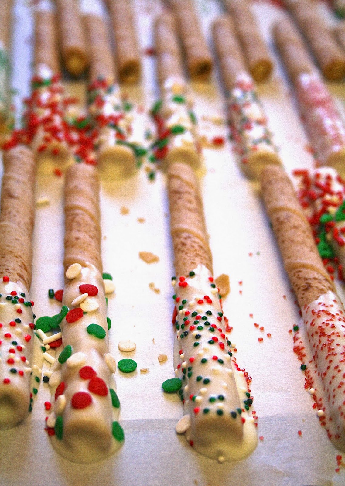 Not only did they turn out super-cute, but these are way more tasty than the pretzel sticks I bought last year. And they are super-easy to make. After melting the vanilla candy, simply dip one half of the pirouette in the candy, place on a piece of parchment paper (this is an important step!), and sprinkle at will.