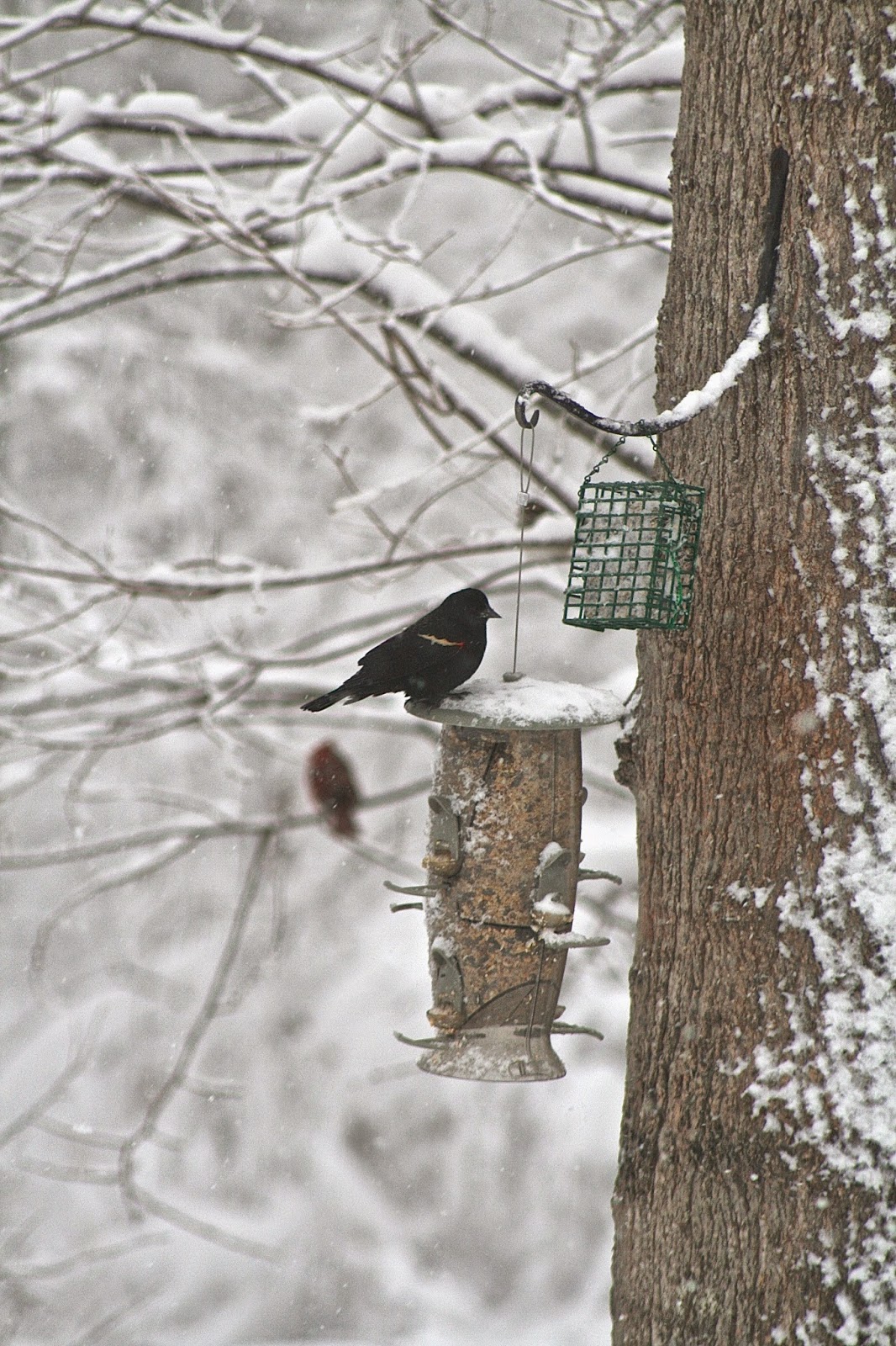 I've had lots of hawks stalking the yard with the snow. It makes sense, there are tons of birds here. I'm trying hard to just let the hawks be, but it's so very much against my nature. However, yesterday I saw 2 hawks snuggling up in a tree. They looked like they were snuggling because they were cold, and I was just hit with a wave of regret. I always go outside, flap my arms, and chase them off. But they must be cold and hungry, just like everyone else. What will be, will be, so my new goal is to just let nature happen. Besides, I've got a flock of crows that's been visiting, and I've seen their pack chase off a hawk. I'll let the crows protect the little birds :)