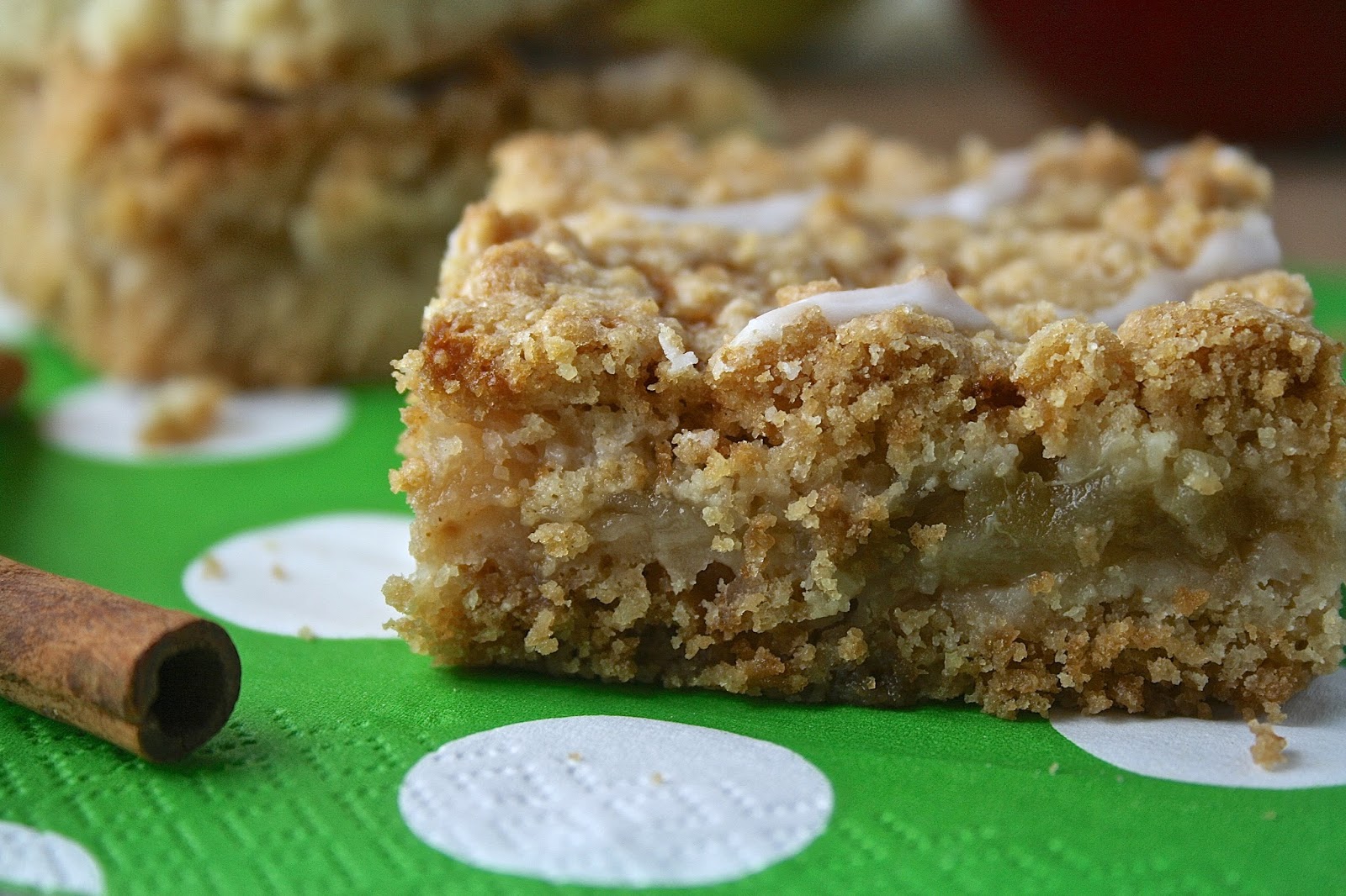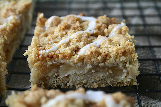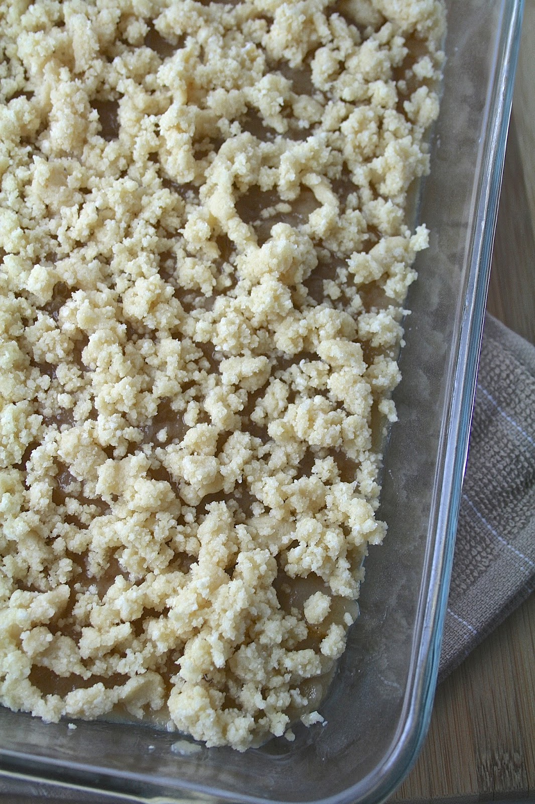 4. Press half the crumb mixture into the pan. Top with cooled compote. Evenly sprinkle the rest of the crumb over the pear mixture. Bake in preheated oven for 45-60 minutes, or until the tops of the bars have evenly browned. Remove from oven, and allow to cool completely before glazing.