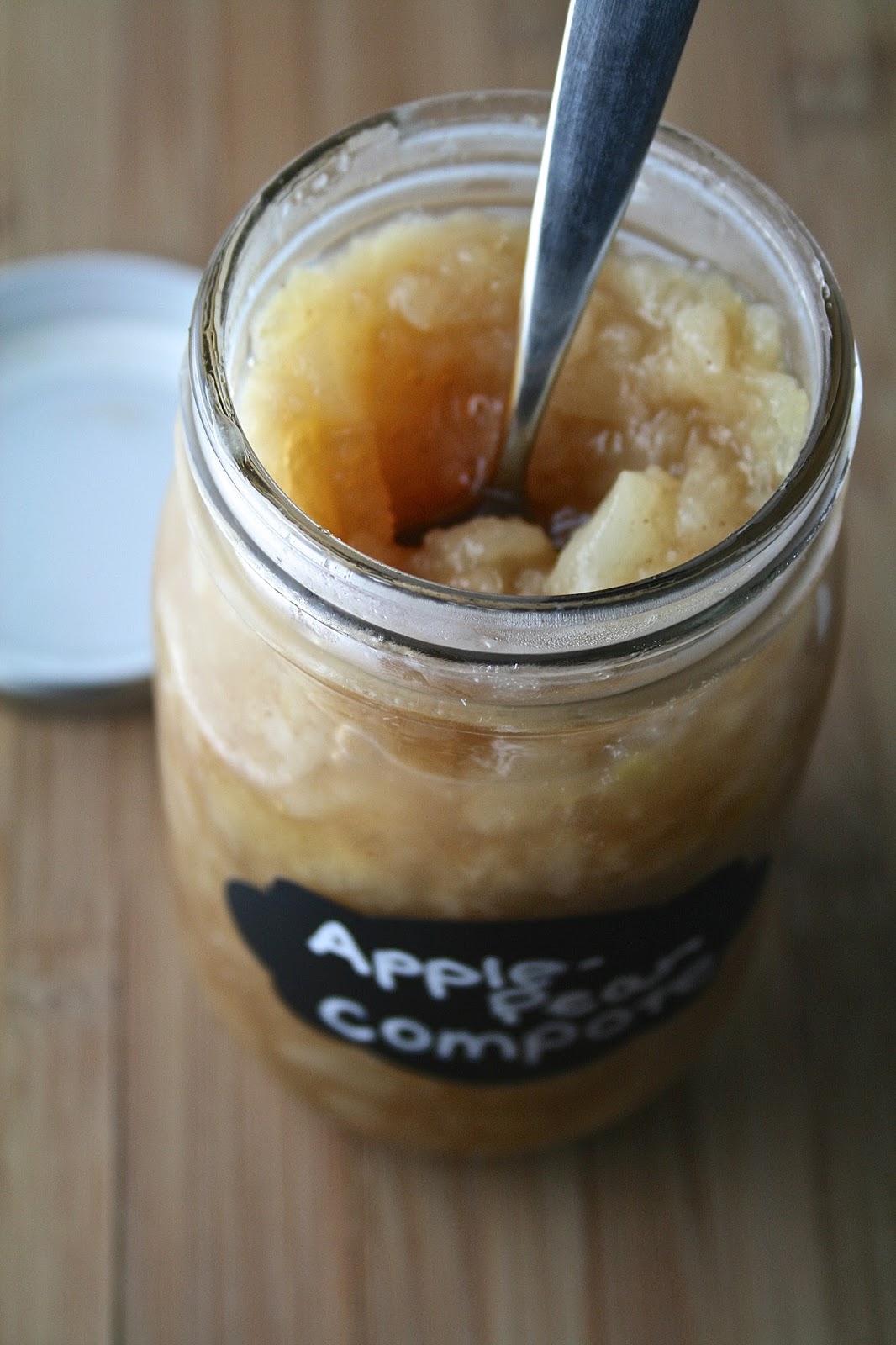 1. Make the compote- Combine pears, apple, cider, brown sugar, vanilla, and cinnamon in a small saucepan. Bring to a boil, stirring often, then lower heat to a simmer. Simmer for 15-20 minutes, or until pears start to break down when you stir the mixture. Take a large spoon and really mash the mixture, until the pears are completely broken down. Remove mixture from heat, allow to cool.