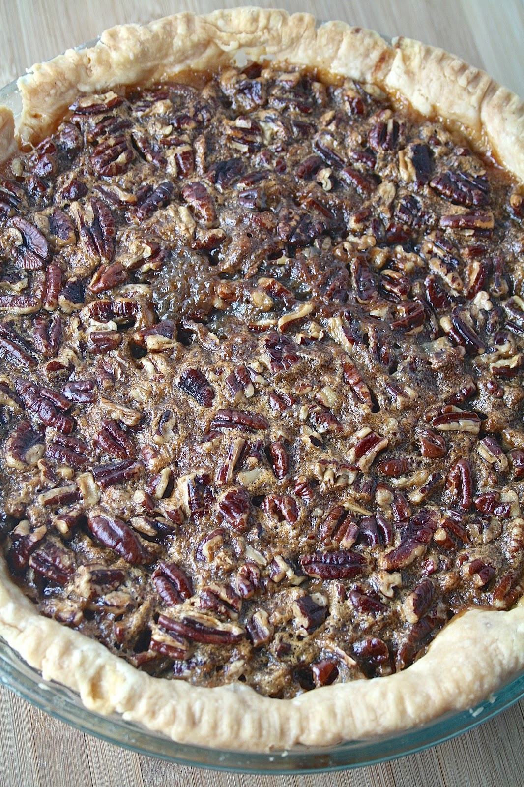 4. Pour filling into pie crust. Evenly distribute pecans on top of the filling. Carefully transfer pie to oven and bake for 30 minutes. Check the pie. If the top is too brown, cover with foil. Bake another 20 minutes. Filling should just jiggle slightly, but not a lot. If pie is done, remove from oven. If filling is soupy and top is too brown, cover with foil and bake another 20 minutes. Remove from heat, and allow to cool on counter. When cooled, chill pie in the fridge before serving or overnight. Slice, and serve with whipped cream or vanilla ice cream.