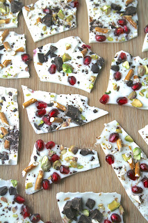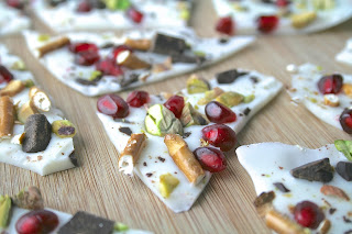 4. Place pan or cookie sheet in the fridge. Allow candy to set for 30-45 minutes. Remove from the fridge, and crack candy into random pieces. Due to the pomegranate arils, I recommending keeping this candy in the fridge in an airtight container. Leftover candy is good for 4-5 days.