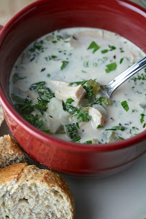 The soup turned out excellent for something that I just threw together. The hubby and I both thought it tasted like a lighter version of Olive Garden's Zuppa Toscana. I say lighter because I perceive chicken as being lighter than the sausage the restaurant chains uses in their's. The broth is light and creamy, and perfect for sopping up with crusty bread.