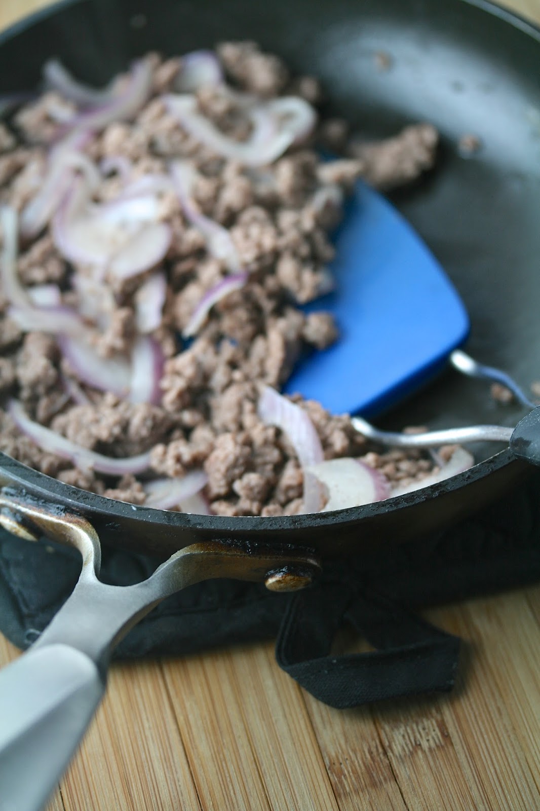 2. Heat olive oil in a small skillet over medium heat. When warm, add lamb. Sauté lamb, stirring to crumble, about 5-6 minutes, or until browned. Add onions, and saute for another 3-4 minutes, or until onions begin to soften. Remove from heat, set aside.