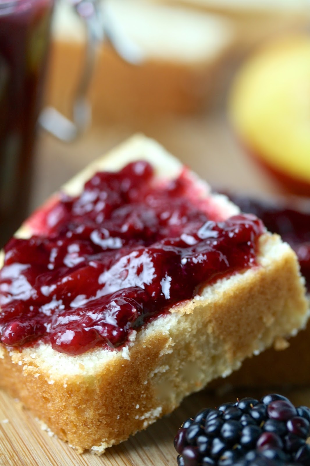 There is a strategic reason I'm posting this bread today. I'm posting it today because it is, officially, the perfect vehicle for my Blackberry-Nectarine Preserves. The two go hand-in-hand like chips and dip, or bacon and eggs. Although, I must confess, this bread is a great companion for pretty much any fruit spread. I slathered some Raspberry Jam on it, and my taste buds were equally pleased. Perfect for breakfast to serve alongside coffee, or a light dessert if you want to add some pudding and whip cream to the mix. Yummmmmm....