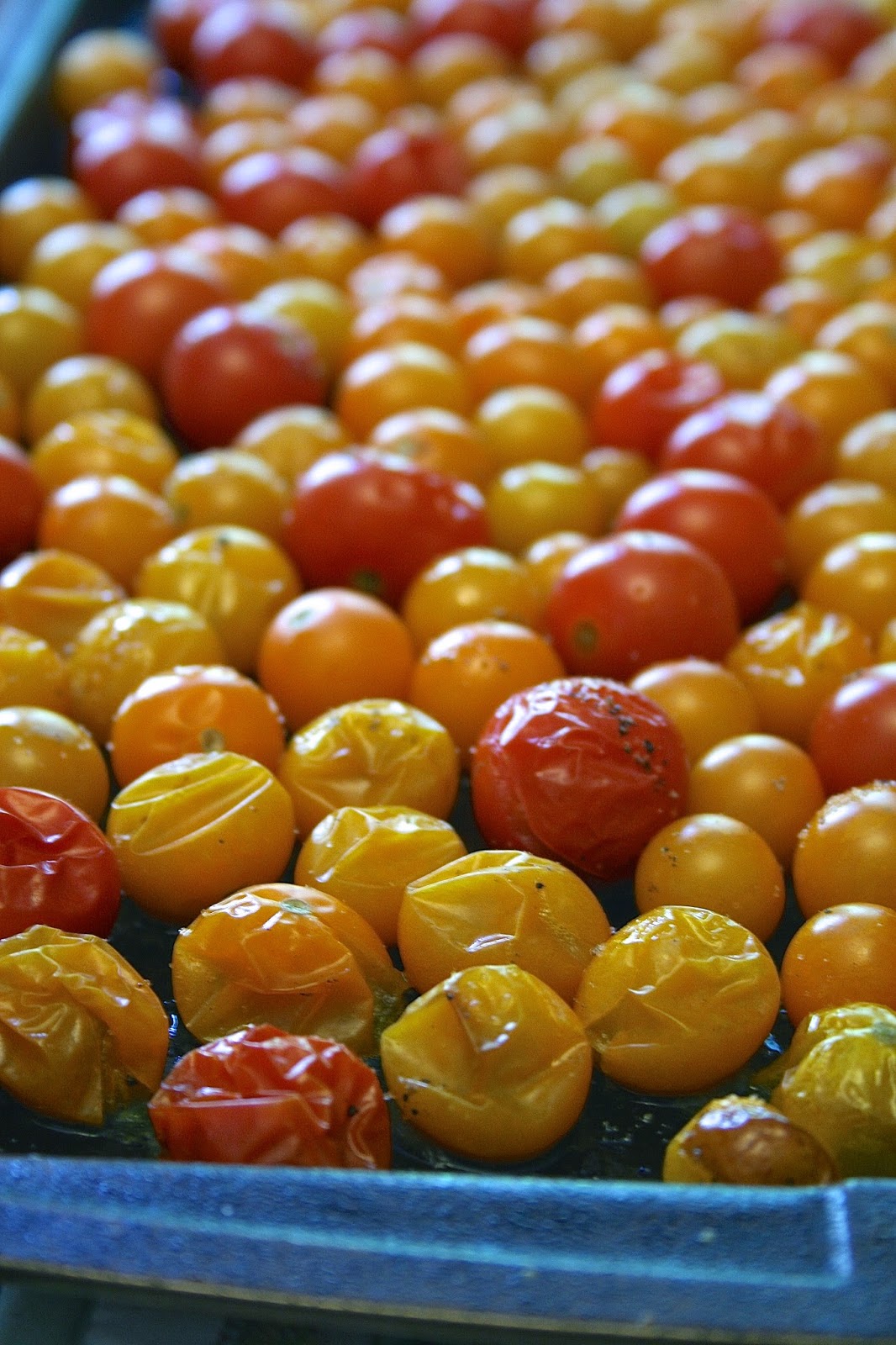 3. Spread cherry tomatoes in a single layer on a cookie sheet. Place tray in preheated oven, roast cherry tomatoes until they begin to collapse and burst (about 15-20 minutes). You can roast the cherry tomatoes with the garlic. Remove from heat and set aside.