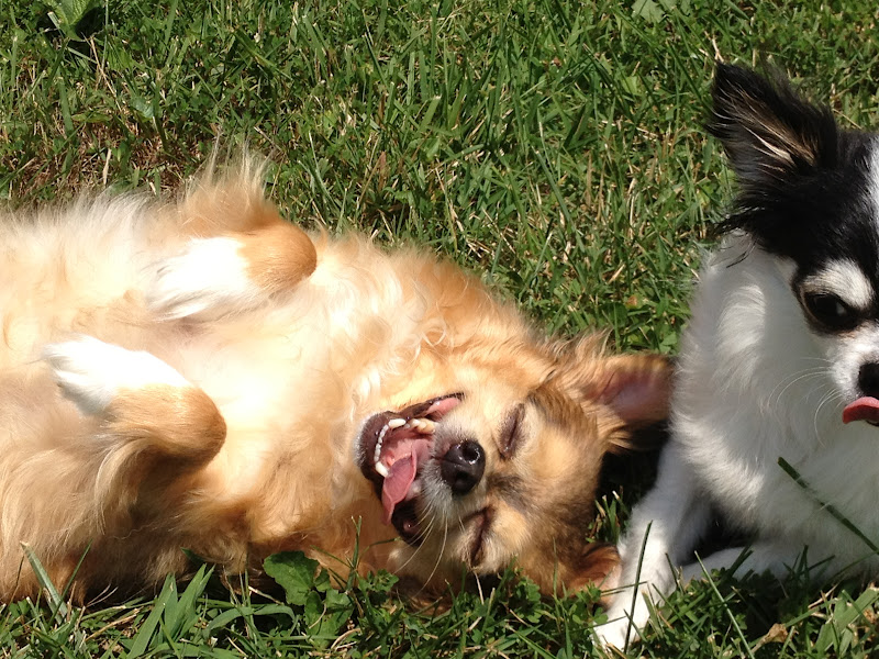 My pups are dealing with a little bit of jealousy and neediness at having an extra dog in the house. Gizmo is bringing me toys a hundred times a day, and I've even caught him guarding the water bowl. Apparently, he doesn't want to share his water. Haloti likes to sit around, and stare at me with puppy dog eyes all day. I'm hoping they too will calm down after a couple of days.