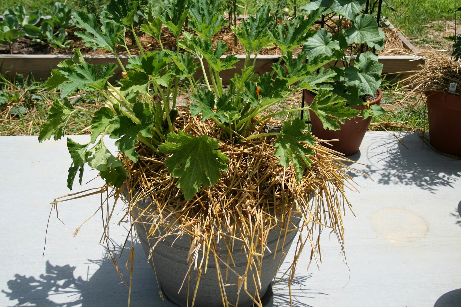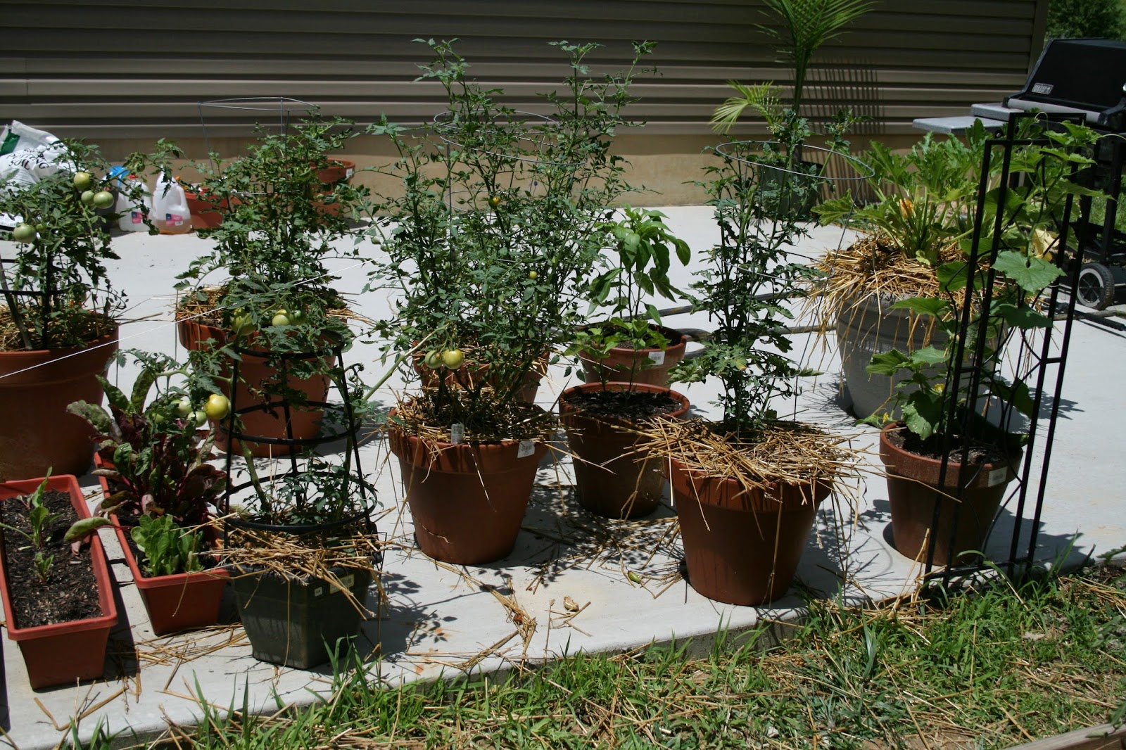 Last week, my roma tomatoes started to look a little worse for wear. I think they got a little root-bound, so I transplanted them into bigger pots. I also read an article about using straw to combat blight, which is the problem I think I'm having. Every plant I've surrounded with straw at the base looks healthier.