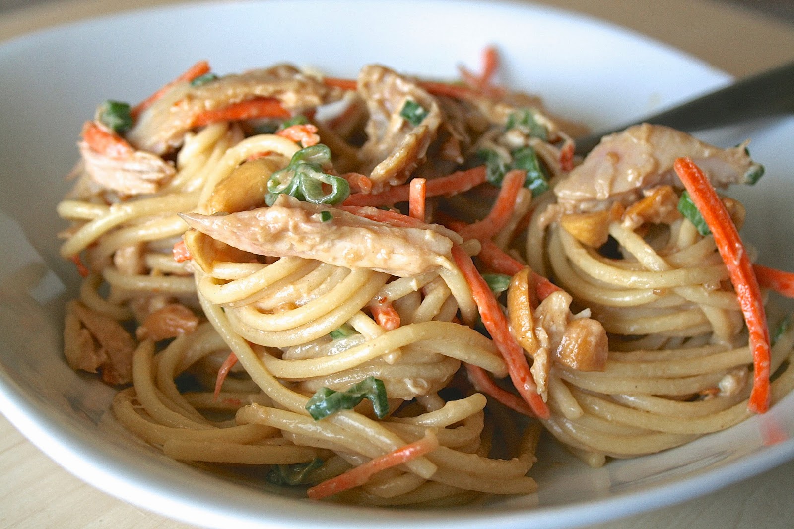 1. In a large bowl, combine cooked pasta with chicken, carrot, onion, and peanuts.