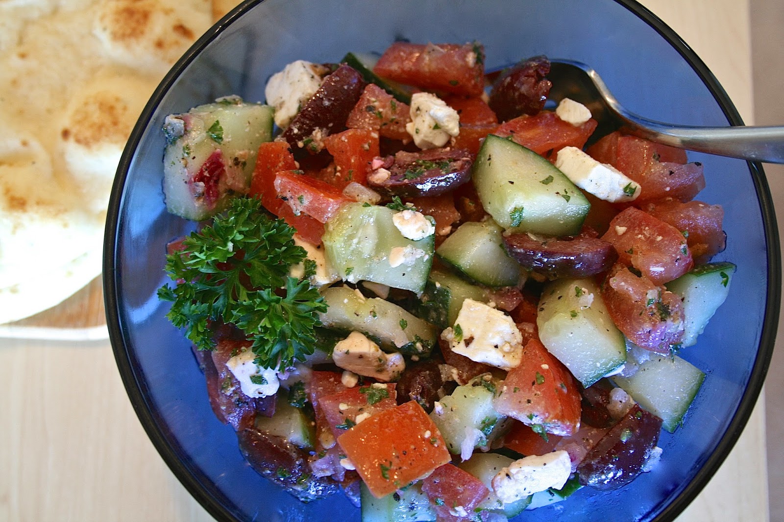 I'm going to share one of my favorite recipes today. In fact, as I was looking through recipes I've already covered, I couldn't believe I hadn't shared this recipe before. It's one I've been making since I first started cooking, and one I've continued to make. If it ain't broke, don't fix it. Greek Salad was one of my first introductions into Greek food, and it helped me realize how much I love the Mediterranean diet. Lots of tomatoes-check. Olive oil- check. Cheese- check. Marinated meats- check. Olives- check please! Greek food (at least what I make at the house!) is always fresh, bright, and freakin' delicious. Sometimes I make Greek Salad to serve alongside Chicken Soulvaki, sometimes (such as this) I serve it with hummus and naan. It's an amazingly versatile salad.